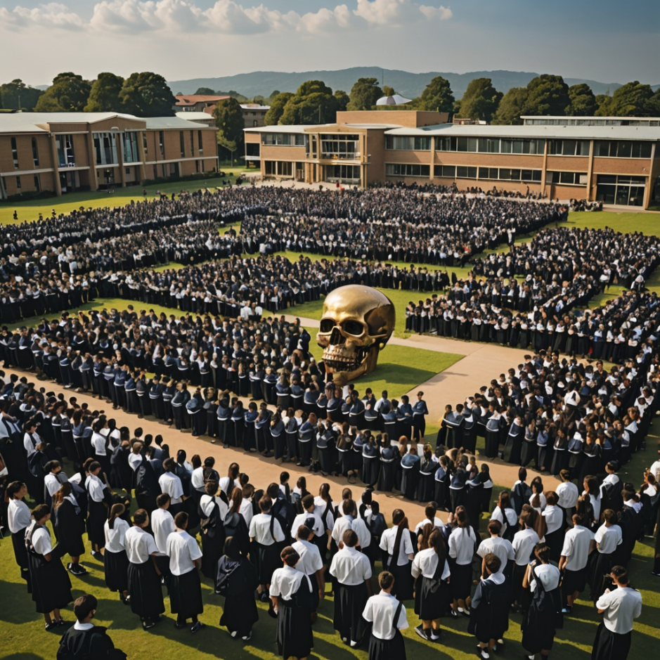 ここは、運営委員が一番最初に無料券を送り付けた私立きらめき学院って高校だよ。ど真ん中に巨大なドクロがある学校って、なかなか無いよねえ。ニクニク君もびっくり。